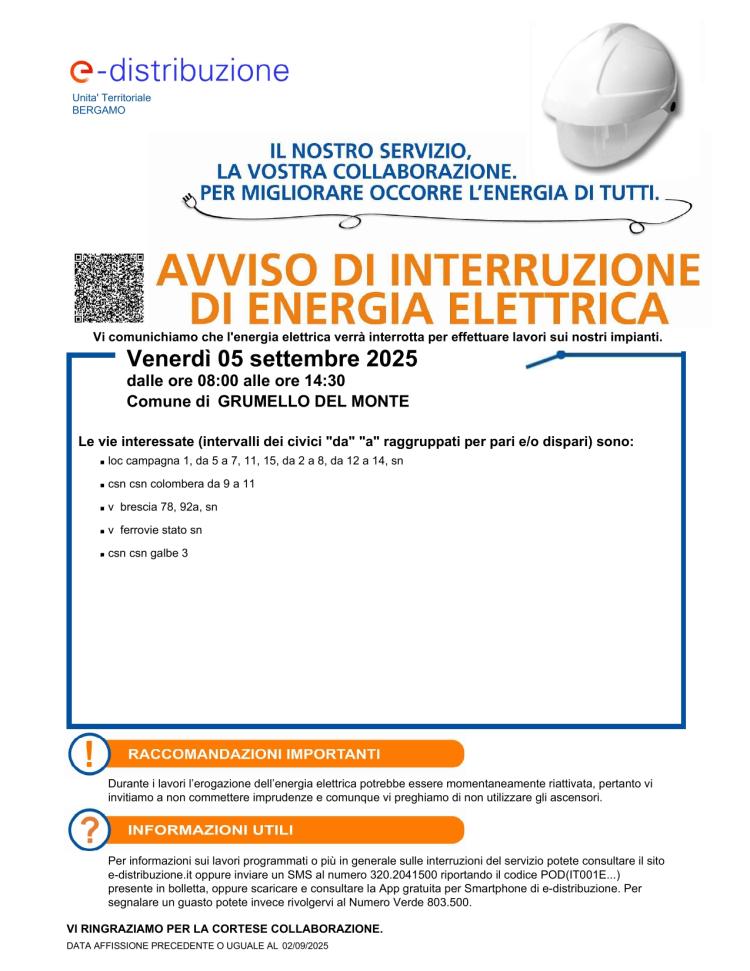 E-Distribuzione informa che l'energia elettrica verrà interrotta per effettuare lavori sui propri impianti venerdì 5 settembre 2025 dalle ore 8:00 alle 14:30