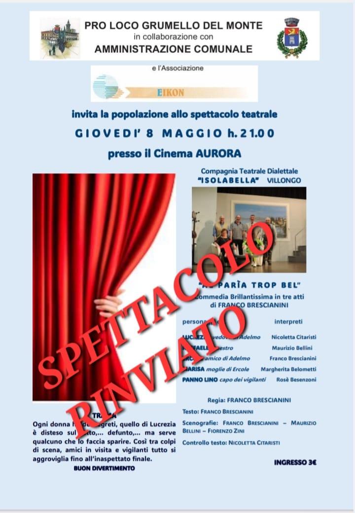 Lo spettacolo teatrale "Al parìa trop bel", previsto per giovedì 8 maggio, è stato rinviato a data da destinarsi.