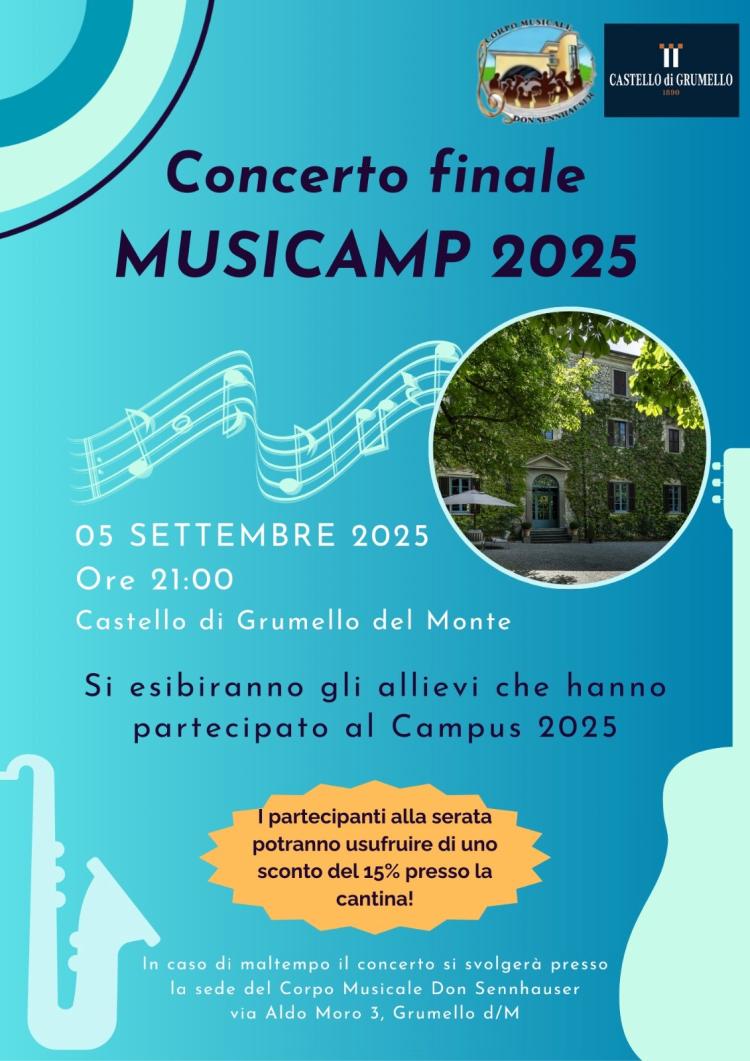 Gli allievi che hanno partecipato al Campus 2025 si esibiranno in un emozionante concerto finale, regalando al pubblico una serata all'insegna della musica e del talento! In caso di maltempo il concerto si terrà presso la sede del Corpo Musicale don Sennhauser in via A. Moro 3
