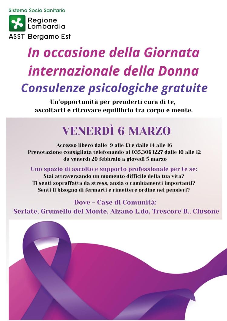 In occasione della Giornata Internazionale della Donna, l'ASST Bergamo Est offre un’importante opportunità dedicata al benessere femminile: una giornata di consulenze psicologiche gratuite.