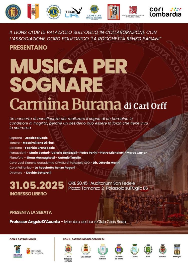 Il Lions Club di Palazzolo sull'Oglio in collaborazione con l'Associazione Coro Polifonico "La Rocchetta Renzo Pagani" presentano "Musica per Sognare Carmina Burana" - 31 maggio ore 20:45 Auditorium San Fedele Piazza Tamanza 2 - Palazzolo sull'Oglio