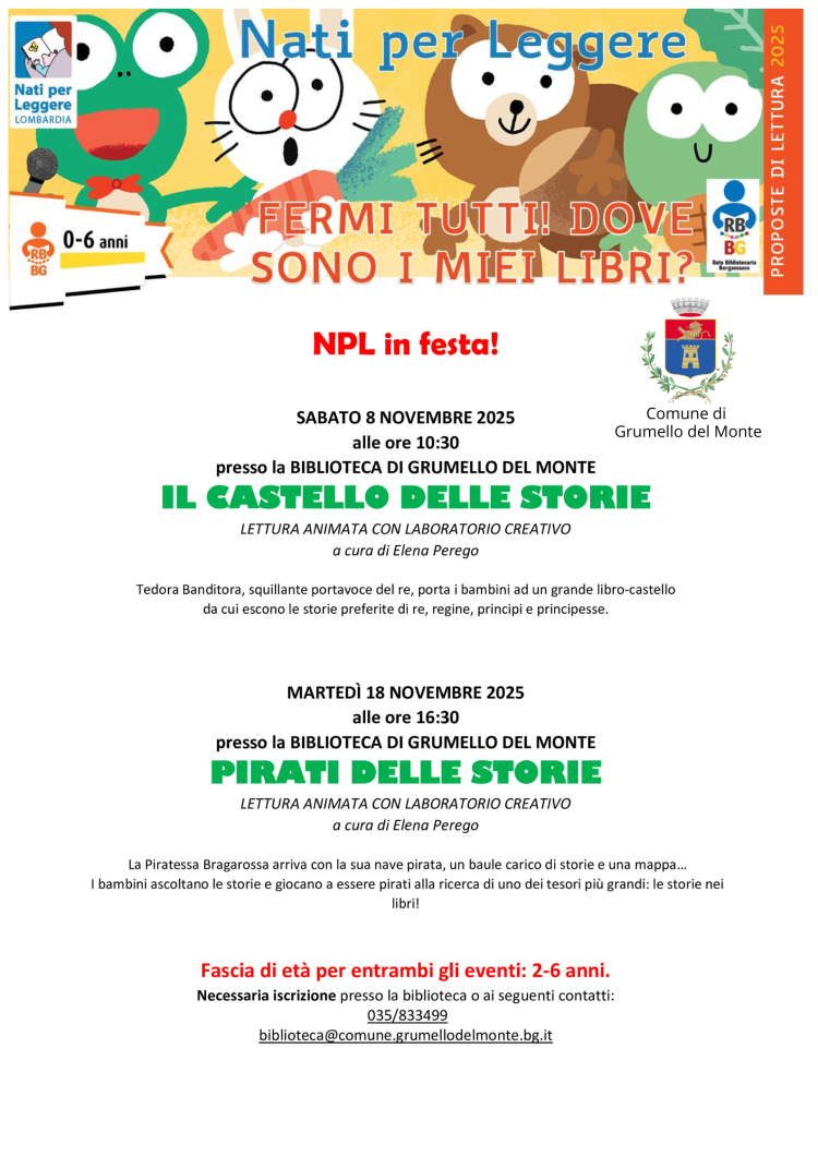 La biblioteca comunale di Grumello del Monte partecipa anche quest'anno al programma Nati per Leggere, con due appuntamenti speciali dedicati ai più piccoli (fascia 2-6 anni)