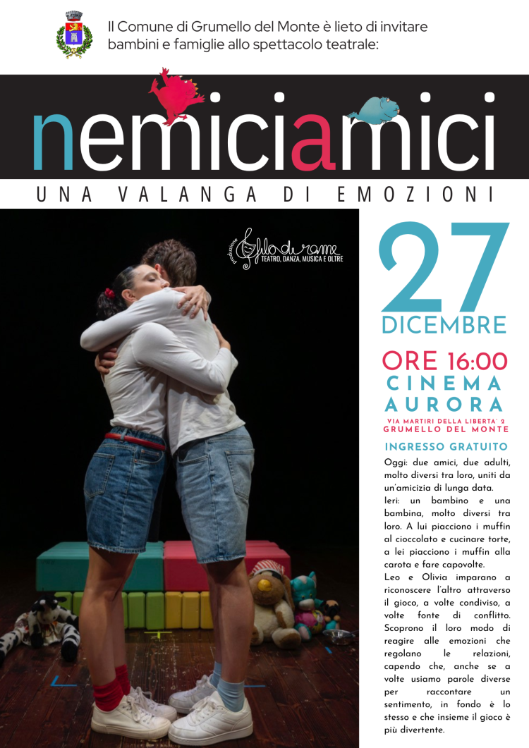 Il Comune di Grumello del Monte è lieto di invitare bambini e famiglie allo spettacolo teatrale: "nemiciamici".