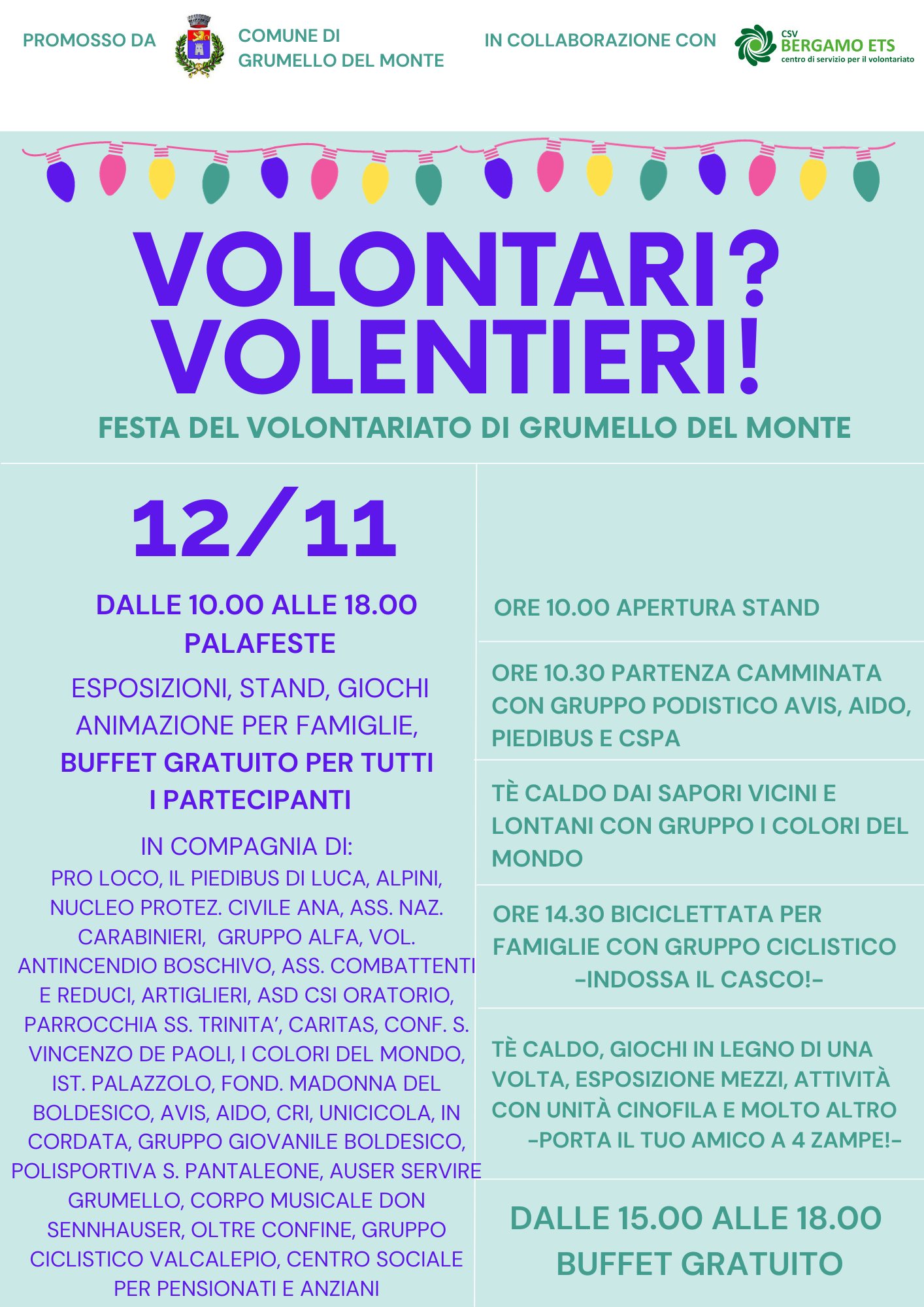 In compagnia di: Pro Loco, Il Piedibus Di Luca, Alpini, Nucleo Protez. Civile Ana, Ass. Naz. Carabinieri, Gruppo Alfa, Vol. Antincendio Boschivo, Ass. Combattenti E Reduci, Artiglieri, Asd Csi Oratorio, Parrocchia Ss. Trinità, Caritas, Conf. S. Vincenzo De Paoli, I Colori Del Mondo, 1st. Palazzolo, Fono. Madonna Del Boldesico, Avis, Aido, Cri, Unicicola, In Cordata, Gruppo Giovanile Boldesico, Polisportiva S. Pantaleone, Auser Servire Grumello, Corpo Musicale Don Sennhauser, Oltre Confine, Gruppo Ciclistico Val Calepio, Centro Sociale Per Pensionati E Anziani.